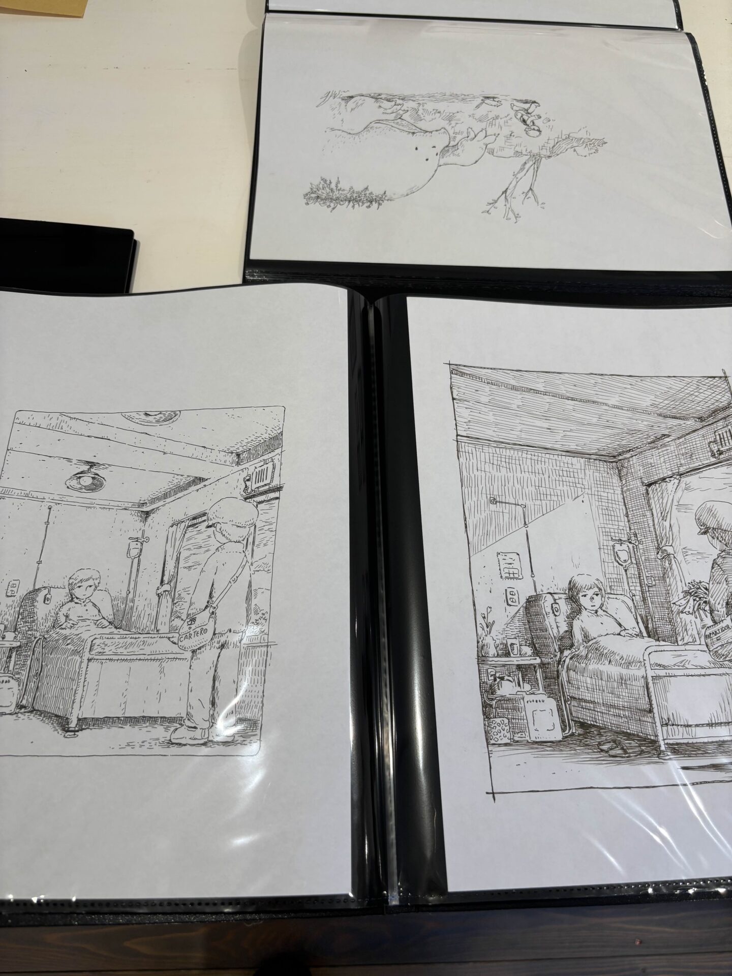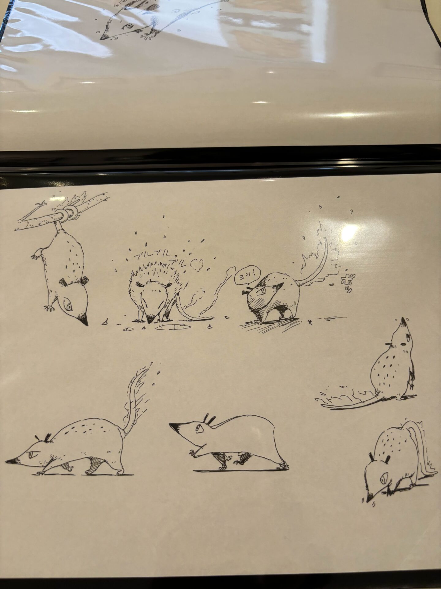 ファイリングされた原画は額に入っている作品よりも距離感が近く、端っこにペンの試し書きがあったり、ボールペンで黒く塗りつぶした部分のデコボコを肉眼で確認出来て面白かったです。