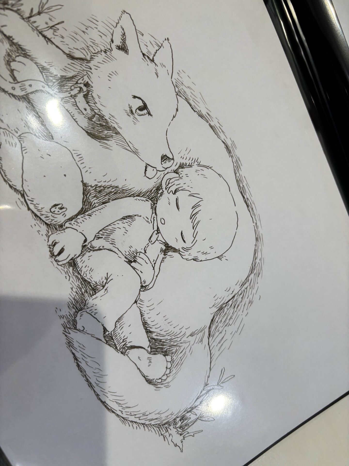 もちろんOUはプレイ済。自分の好きなシーンや動物のイラストがあったらいいなと思っていたところ、それどころではない枚数の展示に圧倒されました。
